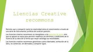 Las licencias Creative Commons permiten compartir y usar creatividad y conocimiento a través de instrumentos jurídicos gratuitos. No reemplazan los derechos de autor sino que permiten modificar los términos de la licencia de una obra. Garantizan cuatro libertades: atribución, no comercial, sin derivados y compartir igual. Facilitan un tipo de simbiosis donde creadores y usuarios se benefician mutuamente y apoyan la sociedad del compartir respetando a autores y sus obras.