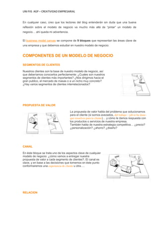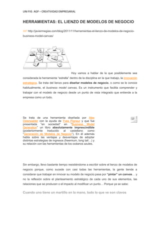 Este documento describe la herramienta del lienzo de modelos de negocio (business model canvas), diseñada por Alex Osterwalder para ayudar a comprender y diseñar modelos de negocio de manera integral. Explica los 9 bloques que componen el lienzo y provee el ejemplo de Nespresso. Aunque es una herramienta útil, también tiene limitaciones como ser demasiado abstracta y no mostrar todas las relaciones clave.
