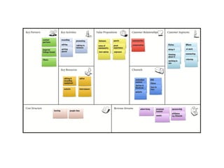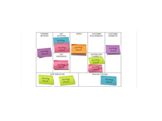 El documento describe el modelo Canvas de generación de modelos de negocio, que se compone de nueve bloques fundamentales: segmentos de clientes, propuesta de valor, canales, relaciones con clientes, flujos de ingresos, recursos clave, actividades clave, red de partners y estructura de costos. Cada bloque se centra en aspectos específicos que ayudan a las empresas a entender y optimizar su propuesta de valor y la forma en que interactúan con sus clientes. También se menciona la importancia de las alianzas estratégicas y cómo los distintos elementos del modelo se interrelacionan para crear un negocio exitoso.