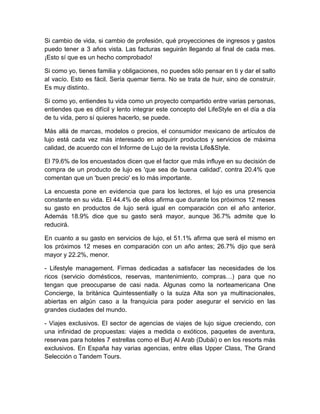 El documento habla sobre el concepto de lifestyle y cómo diseñar un estilo de vida acorde a tus sueños y deseos. Explica que muchas personas viven sus vidas sin planificarlas y terminan agotadas. También discute la importancia de tomar decisiones para lograr un equilibrio entre la vida profesional, tiempo para la familia y aficiones, aunque esto pueda requerir compromisos como mudarse a una ciudad más pequeña o ganar menos dinero. Finalmente, presenta varios negocios y servicios dedicados a satisfacer las necesidades de los clientes de alto