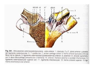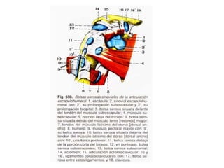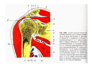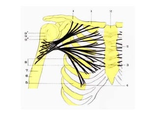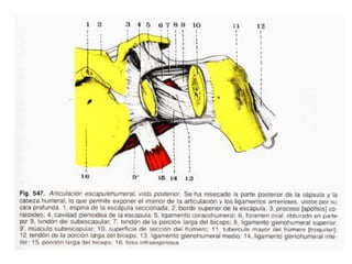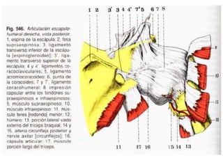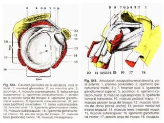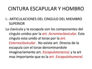 Este documento resume las articulaciones y músculos de la cintura escapular y el hombro. Describe las articulaciones esternoclavicular, acromioclavicular y escapulohumeral, así como los ligamentos asociados. También describe 7 músculos que unen el tronco a la cintura escapular, 2 músculos que unen el tronco al hombro, y 8 músculos profundos que unen la cintura escapular al hombro, incluidos el deltoides, subescapular y los músculos rotadores. Finalmente