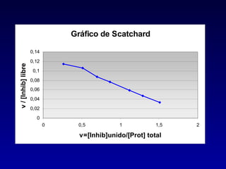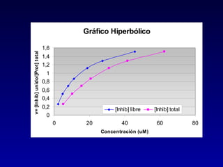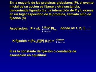 La interacción proteína-ligando ocurre en un sitio específico de la proteína. La constante de asociación y el número de sitios de unión determinan la fuerza de unión. Las curvas de saturación pueden ser hiperbólicas o sigmoidales dependiendo de si la unión es cooperativa o no. Los gráficos de Scatchard y Hill analizan los parámetros de unión y el tipo de cooperación. La hemoglobina exhibe unión cooperativa positiva con oxígeno.