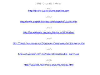 Benito Juárez fue un abogado y político mexicano que sirvió como presidente de México durante la segunda mitad del siglo XIX. Nació en una familia indígena pobre pero logró estudiar leyes. Se opuso a la dominación de la Iglesia y el ejército extranjero en México y promovió reformas liberales como la separación de la Iglesia y el Estado. Juárez es recordado como Benemérito de las Américas por defender la soberanía de México.