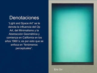 El documento describe el movimiento artístico "Light and Space Art" que se originó en California en la década de 1960 y se enfoca en los fenómenos perceptuales. Los artistas de este movimiento experimentaron con materiales inusuales y la luz para crear efectos en los espectadores. Uno de los artistas más destacados fue James Turrell, cuyas obras llenas de luz buscaban alterar la percepción. Su proyecto más ambicioso fue la transformación de un cráter volcánico en Arizona en un observatorio celestial.