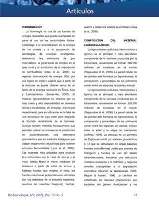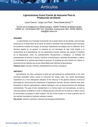 El documento describe la lignocelulosa como una fuente prometedora de azúcares para la producción de etanol. La lignocelulosa, compuesta por celulosa, hemicelulosa y lignina, es el principal componente de la biomasa vegetal. Existen diversos métodos de pretratamiento para mejorar la hidrólisis de la lignocelulosa, como pretratamientos físicos, físico-químicos y biológicos, cuyo objetivo es remover la lignina, hidrolizar la hemicelulosa y reducir la