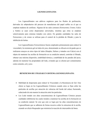 El documento describe los lignosulfonatos, aditivos derivados de subproductos del proceso de fabricación de papel que se usan como dispersantes y para controlar la pérdida de filtrado y arcillas en fluidos de perforación. Los lignosulfonatos ferrocrómicos reducen la viscosidad y resistencia al gel en lodos yesosos y de otros tipos, manteniendo las arcillas en su estado natural y controlando el filtrado y estabilidad de paredes del pozo.