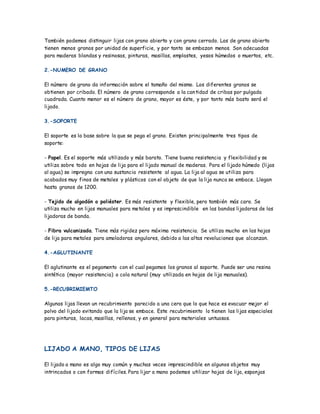 El documento habla sobre el lijado, que es el proceso de alisar una superficie mediante el uso de una lija. Explica que el lijado es fundamental para lograr un buen acabado en la pintura o barniz de una superficie. Además, describe los diferentes tipos de lijas manuales y máquinas para lijar, así como las características de las lijas y los procedimientos de lijado a mano y a máquina.