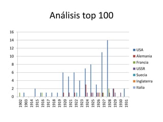 Este documento presenta dos gráficos que muestran el ranking de los principales países en términos de producción científica entre 1902 y 1930. El primer gráfico analiza el top 7 y muestra que Estados Unidos lideró la producción científica durante este período, seguido por Alemania, Francia, la Unión Soviética, Suecia, Inglaterra e Italia. El segundo gráfico representa la misma información para el top 7 durante este período de 1902 a 1930.