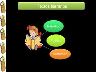 Este documento presenta diferentes tipos de textos literarios, incluyendo narrativos como cuentos, fábulas, leyendas y mitos, y poéticos como poemas, caligramas y acrósticos. También menciona textos literarios dramáticos como tragedias, dramas y comedias. Además, incluye un poema de Gabriela Mistral como ejemplo de texto poético y finaliza con una cita sobre la lectura.