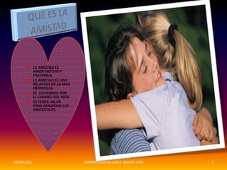 La amistad es un amor mutuo y fraternal que implica compartir cosas buenas y apoyarse el uno al otro durante los obstáculos, ya que los verdaderos amigos están ahí para levantarte cuando otros ni siquiera saben que has caído.