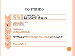 Este documento discute varios temas relacionados con los trastornos del aprendizaje, incluyendo el concepto de aprendizaje y factores que lo influyen, tipos de trastornos como dislexia, disgrafia y discalculia, síntomas y características de estos trastornos, y métodos de detección, evaluación y tratamiento.