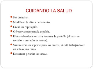 El documento ofrece consejos para cuidar la salud mientras se trabaja frente a una computadora, incluyendo modificar la altura del asiento, crear un reposapiés, apoyar la espalda, elevar el monitor y usar un soporte para los brazos. También enfatiza la importancia de mantener una postura correcta y variar las tareas para evitar lesiones.