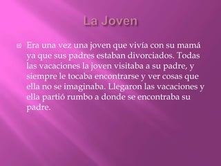 La joven visita a su padre durante las vacaciones y se encuentra con la sorpresa de que están invitados a una boda importante. En la boda, la joven habla con el novio y se entera de que su libro favorito es Martín Fierro. Después de la boda, el padre y la hija toman mate y hablan de refranes populares, lo que lleva a la hija a expresar cuánto disfruta visitar a su padre.