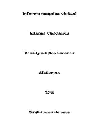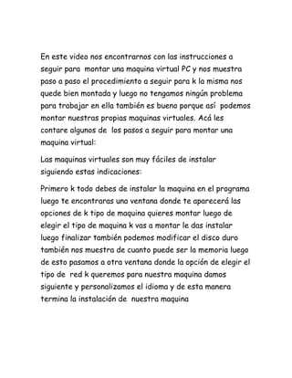Este documento proporciona instrucciones paso a paso para montar una máquina virtual, incluyendo instalar el programa, seleccionar el tipo de máquina, modificar el disco duro y la memoria, elegir la configuración de red, personalizar el idioma, e instalar la máquina virtual. También menciona que las máquinas virtuales son fáciles de instalar siguiendo estas indicaciones y muestra imágenes de ejemplos de máquinas virtuales.