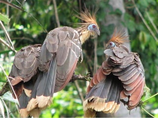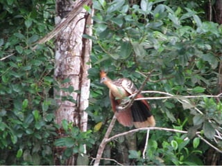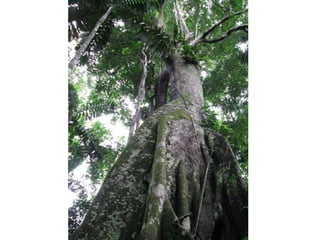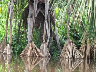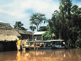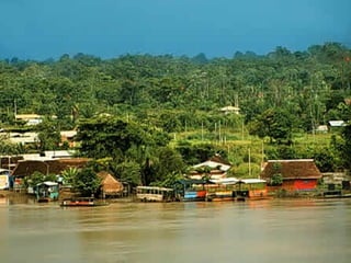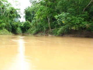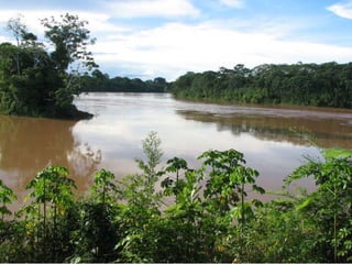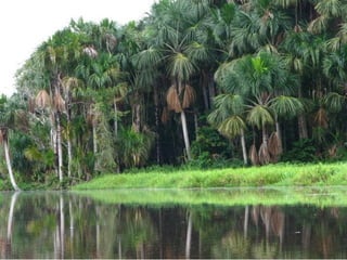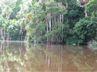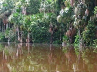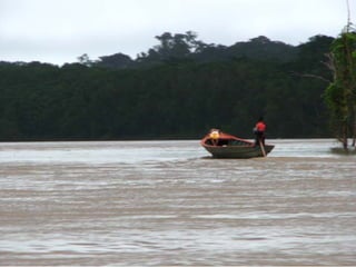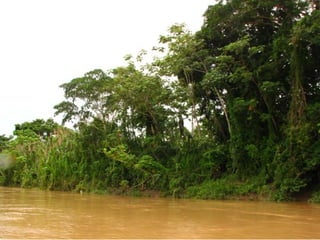 El documento describe un viaje a la Reserva Nacional Tambopata en Perú. Se describe el viaje de varias horas desde Lima y Cusco hasta Puerto Maldonado, y luego una navegación de 3 horas por el Río Tambopata hasta llegar al refugio Explorer's Inn dentro de la reserva. El refugio tiene cabañas modestas y senderos que conducen a lagos con diversa vida silvestre. El documento incluye fotos de la exuberante vegetación, animales como lobos de río y pájaros, e insectos como hormigas y cigarras