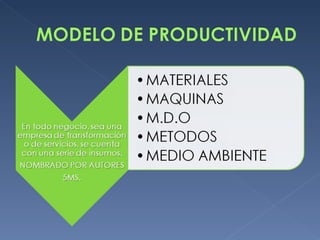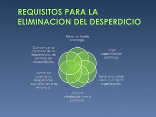 El documento habla sobre la productividad y los desperdicios comunes en las empresas. Define la productividad como obtener mejores resultados con menos recursos y explica que existen tres tipos principales de desperdicios llamados las 3 "Mu": sobrecarga, variabilidad y desperdicio. También enumera varios tipos específicos de desperdicios como producir de más, transporte innecesario, esperas excesivas y movimientos innecesarios que las empresas deben identificar y eliminar para mejorar su productividad.