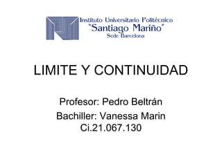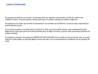 Este documento explica los conceptos de límite y continuidad de funciones. Define el límite de una función como el valor al que se puede acercar la función sin alcanzarlo, y la continuidad como cuando una función cumple tres condiciones en un número: que existan los límites laterales izquierdo y derecho, y que estos sean iguales al valor de la función. También describe tres tipos de discontinuidades: eliminable, esencial e infinita.