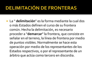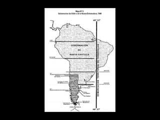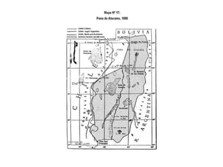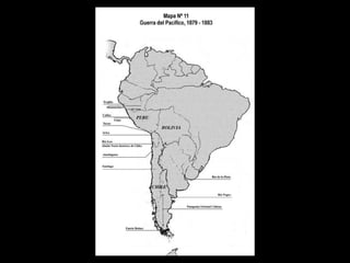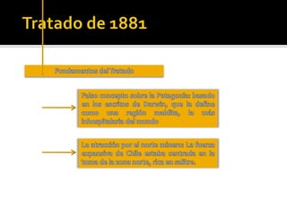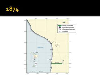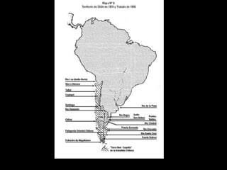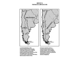 El documento describe la delimitación de fronteras de Chile con sus países vecinos durante el siglo XIX. Resalta la Guerra del Pacífico entre Chile, Perú y Bolivia por la fijación de límites y la explotación de recursos como el salitre. También se menciona la firma de tratados posteriores a la guerra que definieron las fronteras actuales, como la cesión de Tarapacá a Chile y los acuerdos sobre Tacna y Arica. Finalmente, se hace referencia al tratado limítrofe con Argentina en 1881 que estableció los lí