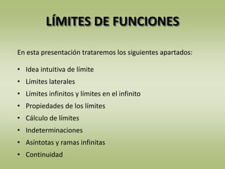 El documento aborda el concepto de límites de funciones, incluyendo sus definiciones, propiedades, cálculo y distintos tipos de indeterminaciones. Se explican límites laterales, límites infinitos y la continuidad de funciones a través de ejemplos y tablas de valores. Además, se ofrecen técnicas para resolver indeterminaciones y se presentan ejercicios prácticos para aplicar estos conceptos.