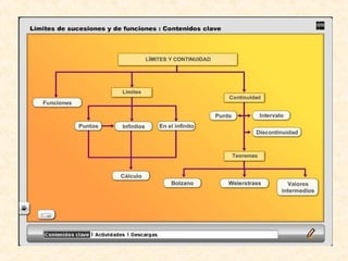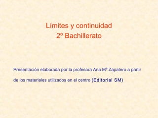 Este documento presenta conceptos básicos sobre límites y continuidad de funciones. Introduce las definiciones de dominio, recorrido y límite de una función en un punto de forma intuitiva y formal. Explica propiedades de los límites como la unicidad y el cálculo de límites simples. Finalmente, clasifica los tipos de indeterminaciones y cómo resolverlas.
