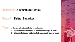 El documento aborda el concepto intuitivo de límite en matemáticas, explorando su aplicación práctica y métodos de cálculo como algebraicos, numéricos y gráficos. Se destaca la importancia de la aproximación a valores específicos y la condición para la existencia del límite, así como ejemplos ilustrativos de funciones. El objetivo es que los estudiantes comprendan y apliquen el concepto de límite en diferentes contextos matemáticos.