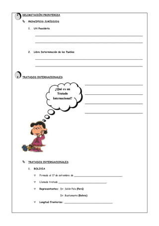 El documento resume la evolución de las fronteras del Perú y los tratados limítrofes firmados con los países vecinos. El Perú perdió territorio con Ecuador, Colombia, Brasil y Bolivia. Los tratados establecieron los límites fronterizos de acuerdo con principios como uti possidetis y libre determinación. Se describen los tratados firmados con cada país, incluyendo fechas, representantes y accidentes geográficos que delimitan las fronteras. Finalmente, se resumen las longitudes de las fronteras terrestres y marítimas