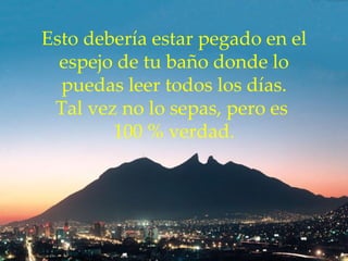 El documento ofrece 10 afirmaciones positivas sobre cómo otras personas pueden pensar y sentir sobre el lector. Alienta al lector a concentrarse en los cumplidos en lugar de los comentarios ofensivos y a mantener una actitud positiva incluso cuando la vida presente desafíos. Finalmente, desea al lector un hermoso día.