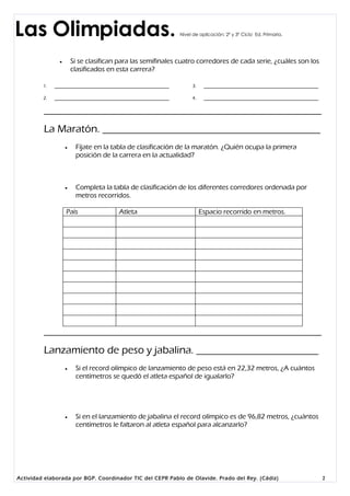 Este documento presenta una actividad para estudiantes de primaria sobre los Juegos Olímpicos. Contiene preguntas sobre países y equipos participantes, una carrera de 1500 metros, una maratón, lanzamientos de peso y jabalina, y vocabulario olímpico. También incluye preguntas sobre el significado de los aros olímpicos y sobre la ciudad española que albergó los Juegos de 1992.
