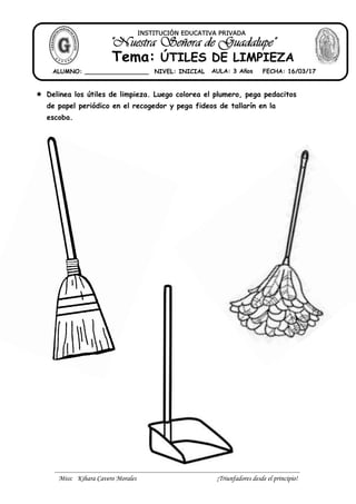 La maestra le pidió a los estudiantes de 3 años que delineen los útiles de limpieza. Luego, les pidió que coloreen el plumero, peguen pedazos de papel en el recogedor y fideos de tallarín en la escoba para representar los útiles de limpieza.