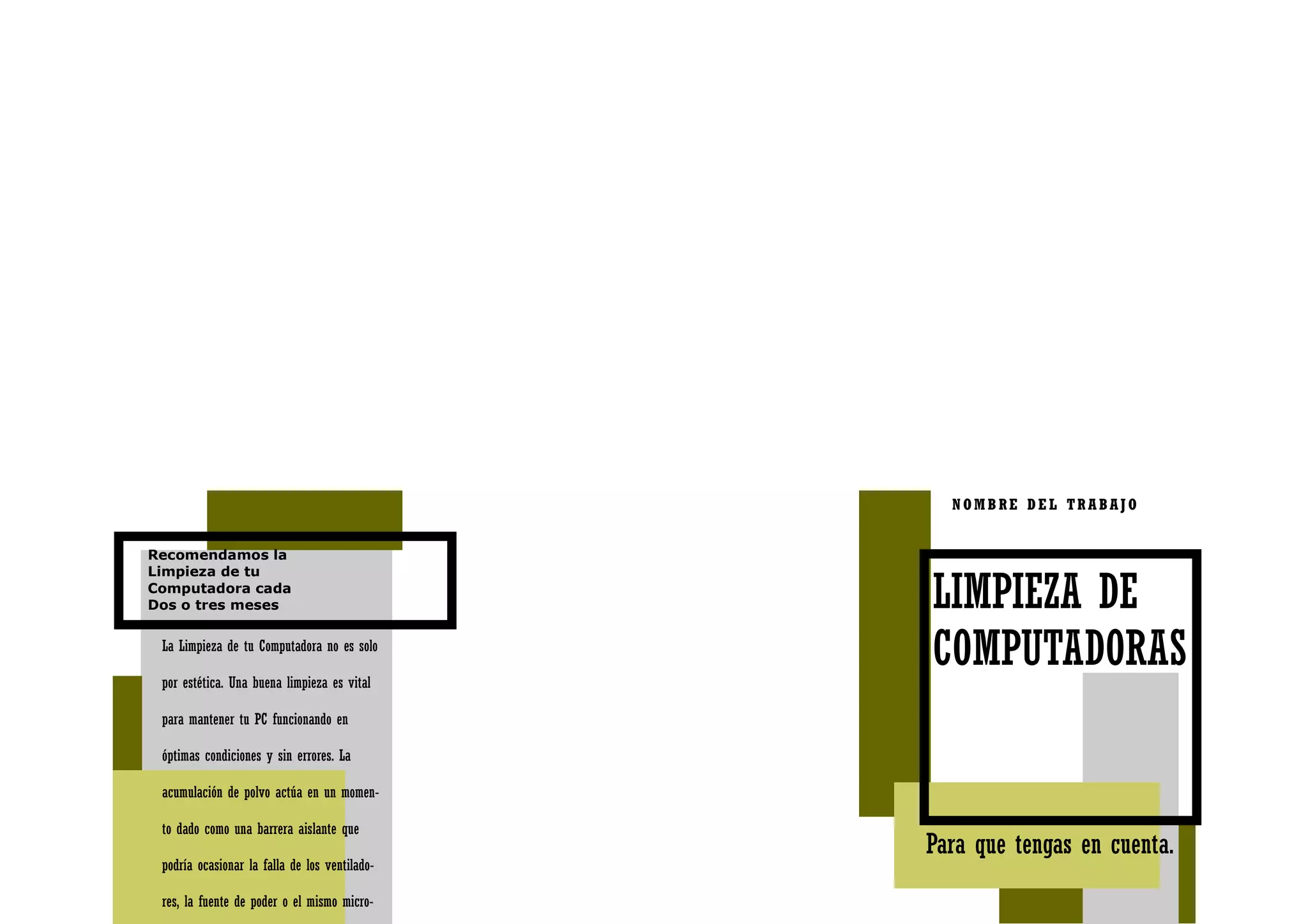 La limpieza de la computadora cada dos o tres meses es importante para mantenerla funcionando correctamente. La acumulación de polvo puede causar sobrecalentamiento y fallas. Para limpiarla, se recomienda usar aire comprimido y espray antiestático para remover el polvo del interior y exterior, incluyendo el monitor, teclado, ratón y ventiladores.