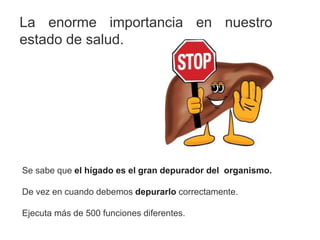El documento describe las funciones y la importancia del hígado para la salud. El hígado es responsable de más de 500 funciones diferentes como filtrar la sangre, producir bilis, metabolizar nutrientes y eliminar toxinas. Es importante ayudar al hígado a depurarse de vez en cuando mediante una dieta saludable y la eliminación de alimentos dañinos.