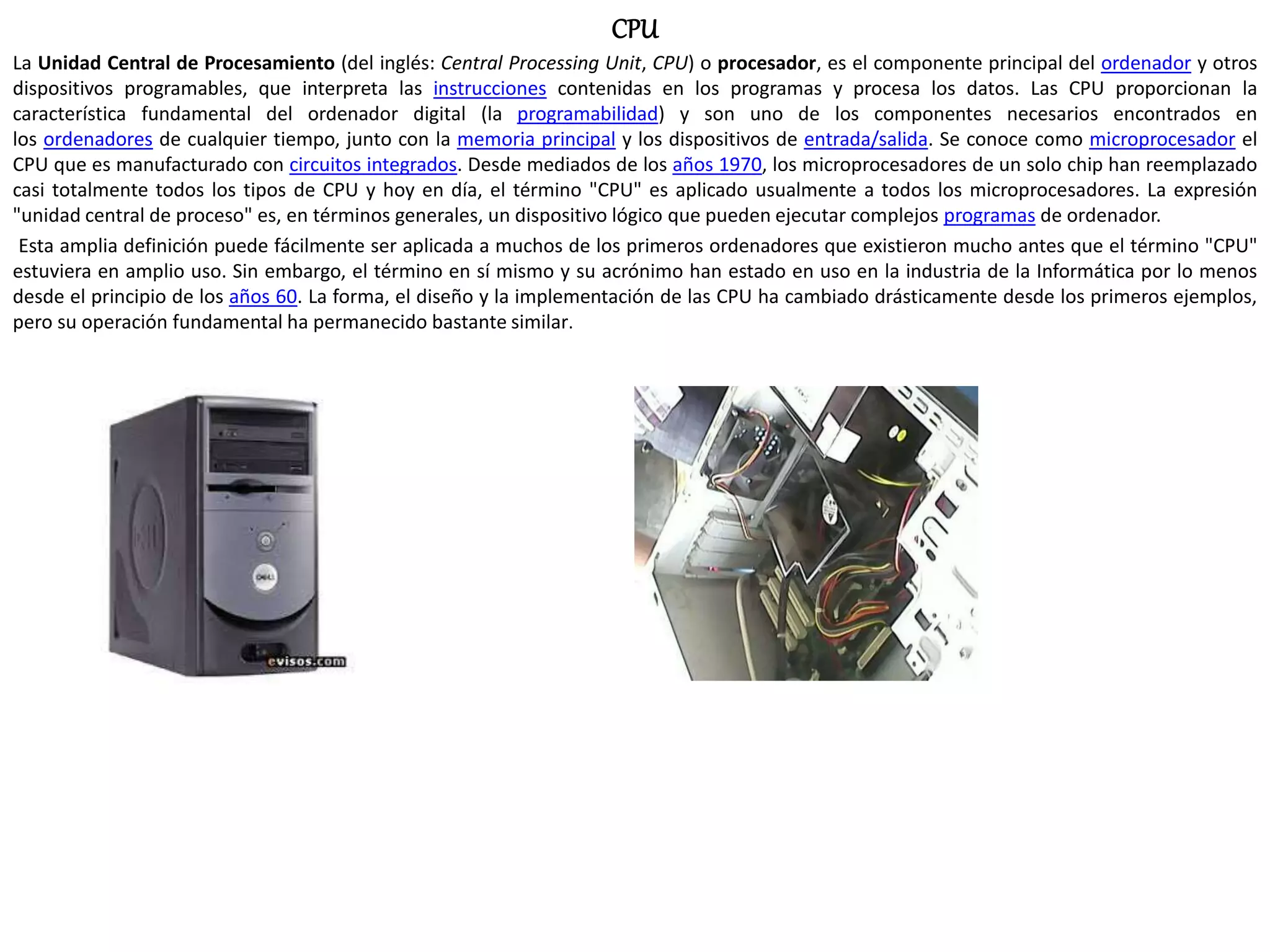 La CPU (Unidad Central de Procesamiento) es el componente principal de un ordenador que interpreta y procesa las instrucciones de los programas. Se conoce como microprocesador a la CPU manufacturada con circuitos integrados, y desde los años 1970 han reemplazado a otros tipos de CPU. La CPU ha cambiado drásticamente desde sus primeras versiones pero su función básica de procesar instrucciones se ha mantenido similar.