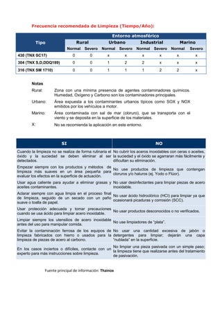 Este documento proporciona instrucciones para limpiar y mantener el acero inoxidable. Explica que el acero inoxidable requiere limpieza periódica para eliminar la suciedad y prevenir el óxido. Luego detalla métodos para limpiar contaminaciones comunes como huellas, grasa, pintura y óxido, así como una tabla con la frecuencia recomendada de limpieza según el tipo de acero inoxidable y entorno. Finalmente, proporciona consejos sobre lo que no se debe hacer al limpiar acero inoxidable, como usar product