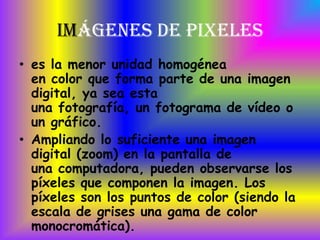 Este documento explica las diferencias entre imágenes de pixeles e imágenes vectoriales. Las imágenes de pixeles están compuestas por la unidad más pequeña de color llamada píxeles, mientras que las imágenes vectoriales están formadas por objetos geométricos definidos matemáticamente. A diferencia de las imágenes de pixeles, las imágenes vectoriales pueden ampliarse sin pérdida de calidad y ser modificadas fácilmente.
