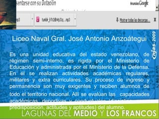 El documento describe el Liceo Naval General José Antonio Anzoátegui, un centro educativo militar en Venezuela. Explica que ofrece educación académica y formación en valores como disciplina y ética. También incorpora tecnología en las aulas y tiene un impacto positivo en la comunidad local a través de proyectos y el uso de sus instalaciones.