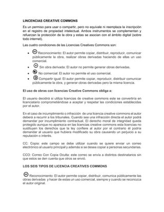 Las licencias Creative Commons permiten a los autores especificar cómo pueden usarse y compartirse sus obras, pero no reemplazan el registro de derechos de autor. Existen seis tipos de licencias que varían en si permiten usos comerciales y la creación de obras derivadas. Al usar una obra con licencia Creative Commons, el usuario acepta respetar los términos establecidos por el autor.