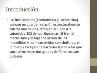 Este documento describe las lincosamidas clindamicina y lincomicina. Aunque no están estructuralmente relacionadas con los macrólidos, se unen a la subunidad 50S de los ribosomas bacterianos e inhiben la síntesis de proteínas de manera similar. La clindamicina es un derivado semisintético más potente de la lincomicina, con mejor absorción oral, menor incidencia de efectos secundarios y mayor actividad contra bacterias anaerobias. Ambas lincosamidas tienen espectro limitado, principalmente efectivas contra bacterias gram
