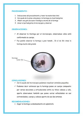Este documento describe un experimento de laboratorio para observar una hormiga usando un microscopio. El objetivo era ver las ventajas del microscopio para observar microorganismos pequeños como la hormiga. Se colocó una hormiga en un portaobjetos, se añadió suero fisiológico y se observó bajo el microscopio a grandes aumentos. Se pudo observar la estructura del cuerpo de la hormiga dividido en secciones y vellosidades en sus extremidades. El microscopio permitió ver detalles de la hormiga que no
