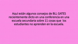 Bill Gates habló brevemente en una escuela secundaria sobre 11 reglas sobre cosas que los estudiantes no aprenden en la escuela, como que la vida no es fácil, el mundo no se preocupa por tu autoestima, y que si fallas en el trabajo puedes ser despedido, a diferencia de la escuela donde hay segundas oportunidades. Gates enfatizó la importancia de aprender de los errores y trabajar duro para tener éxito en la vida real después de la escuela.