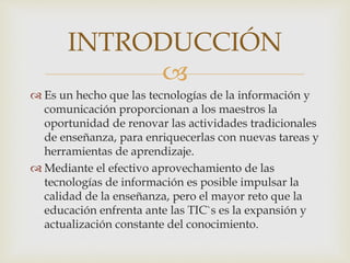 El documento presenta cuatro plataformas educativas en línea que ofrecen recursos y capacitación para docentes. Eduteka y EDUCACONTIC son blogs que comparten estrategias educativas que usan TIC. SINADEP es una plataforma del sindicato de maestros que ofrece cursos gratuitos. La Universidad de Sevilla incluye contenido sobre nuevas tecnologías aplicadas a la educación.