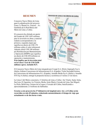 El consorcio Nuevo Metro de Lima ganó la adjudicación para construir la Línea 2 del metro de Lima, con una inversión total aproximada de US$ 5,658 millones que incluye un aporte estatal y ahorros significativos en operación. Este proyecto beneficiará a 2.4 millones de personas al conectar 13 distritos y reducir el tiempo de viaje entre Ate y el Callao a solo 45 minutos. La línea está prevista para transportar inicialmente 665 mil pasajeros diarios, aumentando a 1.15 millones al finalizar las etapas de construcción.
