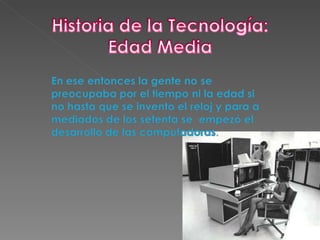 El documento describe la evolución de la tecnología a través de la historia, desde la Edad Antigua hasta la época moderna. Explica que en la Edad Antigua, el hombre desarrolló herramientas de piedra y aprendió a controlar el fuego. En la Edad Media surgieron inventos como los molinos de viento y la pólvora. La Edad Moderna trajo avances como la imprenta. La Revolución Industrial mecanizó la producción con la máquina de vapor. Finalmente, la ingeniería en México comenz