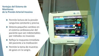 Este documento describe los cuidados de la línea arterial y el monitoreo de la presión arterial invasiva. Ofrece las ventajas del monitoreo de la presión arterial invasiva, las indicaciones médicas y quirúrgicas para su uso, el material necesario, y los cuidados de enfermería requeridos como evaluar la curva arterial, cambiar los componentes cada 96 horas y asegurar la permeabilidad de la línea.