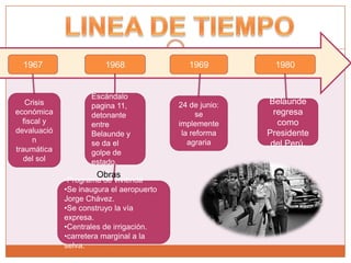 Entre los años 1960 y 1970 en Perú, hubo elecciones presidenciales donde ganó Fernando Belaunde Terry en 1963. Belaunde aplicó programas de obras públicas y cooperación popular, pero su gobierno enfrentó crisis económica. En 1968 se dio un golpe de estado militar que puso fin a su mandato. Luego, Belaunde regresó a la presidencia en 1980.