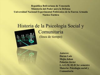 Este documento presenta una línea de tiempo que resume la historia de la psicología social y comunitaria. Comienza en 1965 con la formación de la psicología comunitaria como disciplina y proyecto. En la década de 1970 llega a América Latina orientada a resolver conflictos individuales y sociales. En Venezuela, la psicología comunitaria se enfoca en aspectos ideológicos, políticos y de concientización.