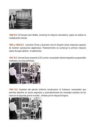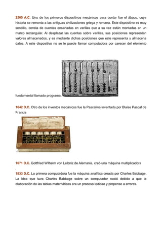 El documento describe la historia del desarrollo de las computadoras desde dispositivos mecánicos antiguos como el ábaco hasta las computadoras modernas. Se detalla la invención de varias máquinas mecánicas y electrónicas importantes y se divide la historia en cinco generaciones basadas en la tecnología subyacente, desde tubos de vacío hasta circuitos integrados y microprocesadores.