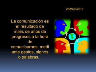 El documento resume la evolución de la comunicación humana desde la prehistoria hasta la actualidad. Comenzó con la comunicación oral y las pinturas rupestres, luego se desarrollaron sistemas de escritura como los jeroglíficos y el alfabeto. Más adelante hubo avances como el papel, la imprenta, el telégrafo, el teléfono y la radio. Finalmente, la televisión y la internet revolucionaron la comunicación a distancia permitiendo transmitir voz, imágenes y datos de forma casi instantánea en todo el mundo.