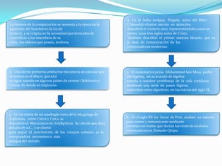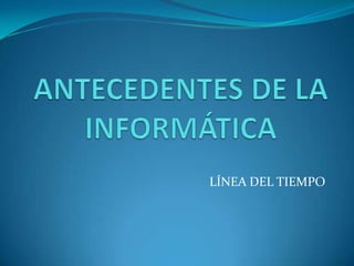 La línea del tiempo describe la evolución de la computación desde sus orígenes hasta la segunda generación de computadoras. Algunos de los hitos más importantes incluyen el ábaco, la máquina de Antikythera, la invención del cero en la India, las máquinas mecánicas de Pascal y Leibniz, la máquina analítica de Babbage, la ENIAC y la EDVAC que usaban válvulas de vacío, y el desarrollo de las primeras computadoras con transistores que definieron la segunda generación. La lí