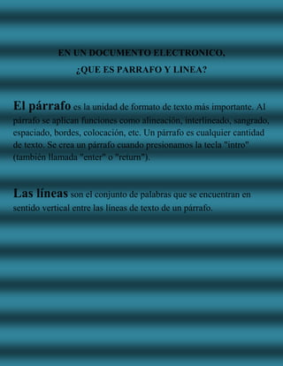 Un párrafo es la unidad de formato de texto más importante en un documento electrónico. Se crea un párrafo al presionar la tecla Intro y permite aplicar funciones de formato como alineación y sangrado. Las líneas son las palabras dispuestas verticalmente entre las líneas de un párrafo.