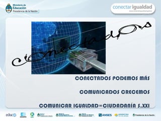 El documento habla sobre el Programa Conectar Igualdad en Argentina. Menciona al equipo de coordinación y los recursos humanos necesarios para satisfacer la demanda del programa. Detalla los materiales pedagógicos desarrollados y la necesidad de fortalecer la investigación, formación docente y producción de software educativo local para aprovechar plenamente el potencial del programa en pos de la inclusión social y educativa.
